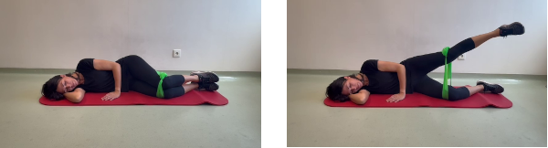 Tumbados de lado, con la goma elástica rodeando nuestras rodillas que estarán ligeramente flexionadas. Durante todo el ejercicio mantendremos el abdomen y los glúteos contraídos. Subimos la pierna que se encuentra arriba, separándola de la otra y tensando la goma. Mantendremos esta posición final entre 3 y 5 segundos. Posteriormente volvemos lentamente a la posición inicial.