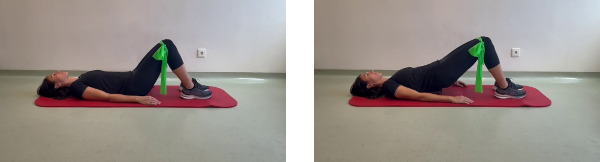 Boca arriba, manteniendo la zona lumbar en total contacto con la superficie y los abdominales contraídos con la banda atada alrededor de nuestras rodillas. Elevamos los glúteos, alejándolos de la superficie y tensamos la goma separando nuestras rodillas. Mantenemos esta posición durante 3-5 seg. Posteriormente, destensamos la goma y bajamos glúteos hasta el suelo volviendo a la posición inicial.