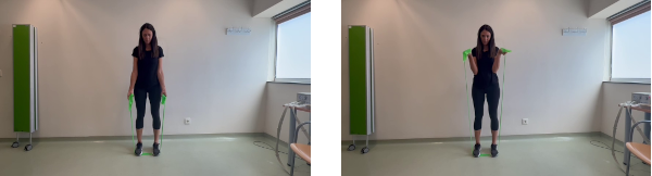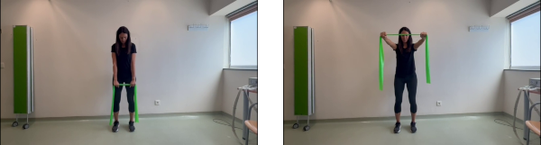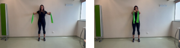 De pie, con los pies a la altura de caderas y con las rodillas semiflexionadas. Cogemos la banda elástica con las dos manos y con los codos estirados. Desde aquí, subimos las manos a la altura de nuestros hombros.Tensamos ligeramente la banda elástica. El abdomen y los glúteos deben estar contraídos. Mantenemos la tensión entre 3 y 5 seg. Posteriormente volvemos lentamente a la posición inicial controlando el movimiento.