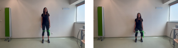 De pie, con las piernas separadas a la misma distancia que nuestras caderas. Colocamos la banda elástica rodeando nuestras rodillas y atamos los extremos. Ponemos una pelota entre nosotros y la pared a la altura de nuestra espalda. Sin perder el contacto con la pelota, doblamos nuestras rodillas, agachándonos y deslizando la pelota por nuestra espalda contra la pared sin que se caiga. Según bajamos tensamos ligeramente la banda elástica. Las rodillas no deben sobrepasar la línea de los pies. Posteriormente volvemos lentamente a la posición inicial.
