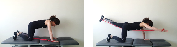 A cuatro patas, con una banda elástica sujeta con mano y pie contrarios, con la zona lumbar firme y el ombligo metido hacia dentro, elevaremos brazo y pierna contraria, manteniendo la espalda estable, sin que se arquee. Aguantamos 5 segundos y volvemos despacio a la posición de reposo.