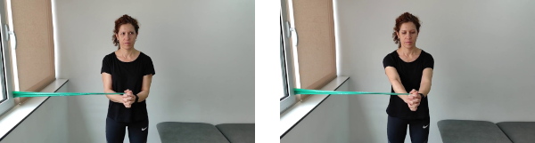 De pie, con las rodillas ligeramente dobladas, las manos entrelazadas y con una banda elástica agarrada y atada a un picaporte lateralmente. Apretamos el abdomen y estiramos los brazos hacia delante, desplazando las manos, mantenemos 5 segundos en la posición y volvemos despacio. Nos damos media vuelta y realizamos el mismo ejercicio con el lado contrario.