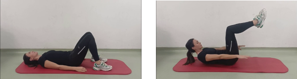 Tumbado boca arriba con las piernas y las caderas flexionadas a 90º, los brazos estirados junto al cuerpo y la cabeza y los hombros elevados. La zona lumbar pegada a la colchoneta con el ombligo hacia adentro y arriba. Se realiza un bombeo con los brazos hacia arriba y hacia abajo con energía y con control, evitando mover el tronco y manteniendo el abdomen plano y estable. Hacemos 5 bombeos cogiendo aire y otros 5 echando el aire. Al finalizar volvemos a la posición de partida.