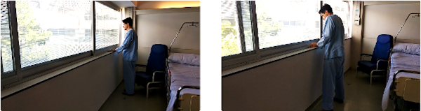 De pie, con las manos apoyadas en el alféizar de la ventana, nos vamos desplazando lateralmente primero hacia un lado y después hacia el otro.
