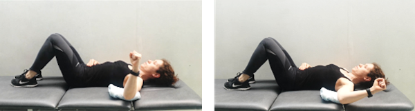 Tumbados boca arriba con el brazo separado del cuerpo en ángulo recto, una toalla puesta debajo para estabilizar y el codo doblado, desplazamos la mano hacia atrás hasta la máxima amplitud que podamos, aguantamos 5 segundos y volvemos despacio a la posición de reposo. No despegamos el brazo de la superficie de apoyo.