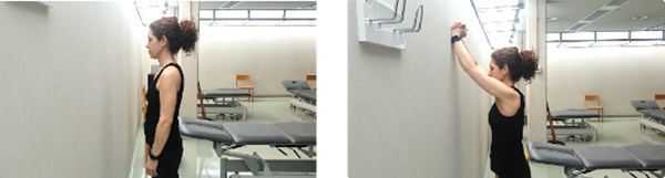 De pie frente a la pared, cogemos la mano del brazo afecto y apoyaremos el canto del meñique, elevaremos el brazo pasivamente deslizando las manos por la pared hasta la máxima altura que podamos alcanzar. Aguantamos 5 segundos con los brazos elevados y bajamos despacio, llevando pasivamente el brazo a la posición de descanso con las manos apoyadas en la pared.
