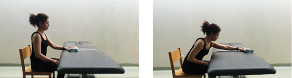Sentados frente a una mesa, situaremos la mano sobre ella con un paño y lo deslizaremos hacia delante, movilizando el cuerpo, aguantamos 5 segundos y regresamos a la posición de descanso.