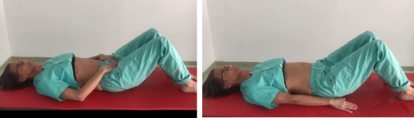 Vamos a realizar unos ejercicios para trabajar la incontinencia, tanto de heces como de orina. Empezamos tumbados boca arriba sobre la cama o el suelo. Flexionamos las rodillas y apoyamos los pies. Las rodillas deben estar a la altura de las caderas. Localizamos los huesos que más sobresalen de la pelvis. Sobre ellos colocamos los talones de las manos y los dedos los apoyamos en dirección al pubis. Las manos deben estar paralelas al suelo. Elongaremos el cuerpo, como si quisiéramos crecer o alguien tirara de nuestra cabeza. Mantenderemos esta posición durante todo el ejercicio. Tomamos aire, hinchando la tripa y lo dejamos salir lentamente con la boca abierta, sin empujarlo. Es importante que al echar el aire evitemos cerrar las costillas, fruncir los labios o exhalar empujando el aire.