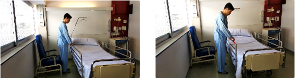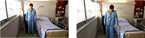 De pie, al lado de la cama y con las manos apoyadas en la barandilla de la misma, nos desplazamos lateralmente primero hacia un lado y después hacia el otro.