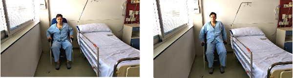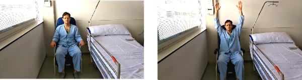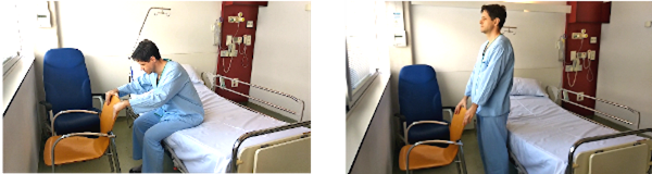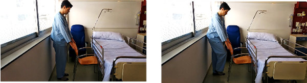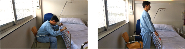 Sentados en una silla, con la barandilla de la cama en frente. Los pies apoyados a la altura de las rodillas. Nos agarramos a la barandilla, inclinamos el cuerpo hacia delante hasta que notemos el peso del cuerpo en las rodillas y en los pies y nos impulsamos con los brazos apoyándonos en la barandilla.