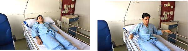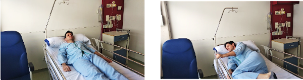 Tumbados en la cama, giramos el cuerpo sobre el costado derecho. Para ello nos ayudaremos con la flexión de la pierna izquierda y agarrándonos con la mano izquierda en la barra de la cama.