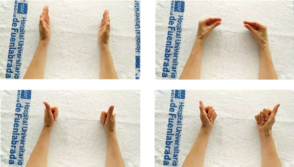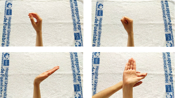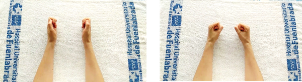 - Manteniendo los dedos, muñeca y pulgar extendidos giramos el antebrazo para que la palma mire hacia arriba.