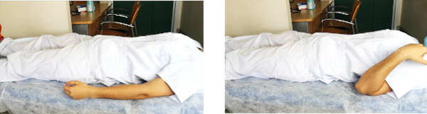 Tumbados boca arriba, con el brazo a lo largo del cuerpo, llevamos la mano hacia el hombro del mismo lado, para conseguir la máxima flexión de codo. Posteriormente volvemos a la posición inicial, de máxima extensión de codo. Se puede hacer tanto con la palma hacia arriba como con la palma hacia abajo.