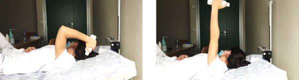Tumbados boca arriba, cogemos un peso con la mano afecta. Situamos el peso por encima del hombro, al lado de la cabeza de tal manera que el codo apunte hacia arriba. Estiramos el codo todo lo que podamos, llevándolo hacia el techo, para llegar a la máxima extensión. Posteriormente volvemos lentamente a la posición inicial.