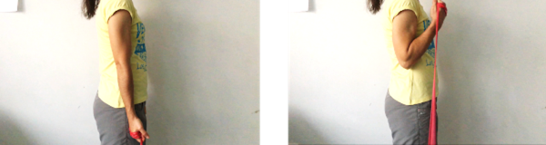 De pie, con una banda elástica por detrás de la espalda a la altura de las escápulas y sujeto con ambas manos y con los codos estirados empujamos con los hombros hacia delante, aguantamos 5 segundos y volemos despacio a la posición de reposo.