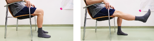 Sentado en una silla, extendemos la rodilla por completo, llevando los dedos del pie hacia nosotros. Mantenemos durante 5 segundos y volvemos a la posición inicial lentamente, sin dejar caer el pie. Descansamos 5 segundos y repetimos.