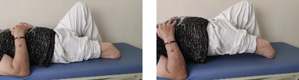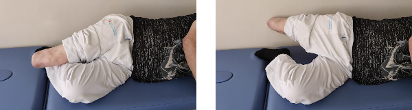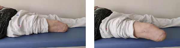 Tumbados del lado de la pierna sana, mantenemos esta flexionada por la rodilla y cadera para tener mejor equilibrio en esta posición. Separamos la pierna amputada todo lo posible y mantenemos durante 5 segundos en la posición de máxima separación. Luego volvemos a la posición de partida descansando también durante 5 segundos. Es muy importante no flexionar la pierna amputada al elevarla, es decir, no echarla hacia adelante.