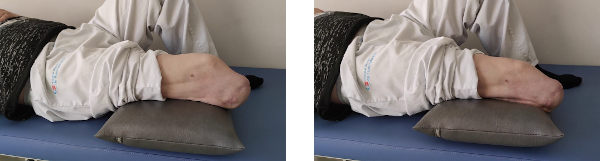 Tumbados boca abajo y con una almohada bajo la zona abdominal, hacemos extensión de la pierna amputada, es decir, elevamos la pierna todo lo que podamos intentando no separar demasiado la cadera de la camilla. Mantenemos 5 segundos antes de volver a la posición de partida y descansar otros 5 segundos.