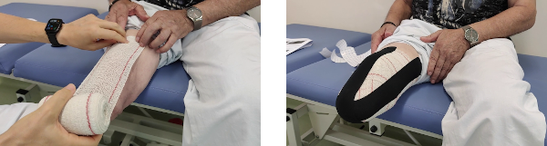 El vendaje del muñón es necesario realizarlo diariamente, pues su objetivo es conseguir la forma cónica adecuada para después colocar la prótesis. Procedemos con una banda elástica a dar dos vueltas de proximal a distal sobre el muslo, y luego realizamos dos vueltas proximales “en horizontal” para fijar ese trabajo realizado. A partir de ahí, colocamos la venda pasando por la zona distal del muñón, de forma que la mayor presión tenga lugar en la zona más distal y alternamos la colocación del vendaje una vez en parte interna y otra en parte externa, así durante 3 ó 4 veces (dependiendo del tamaño del muñón) y en cada ocasión la venda se va situando más externamente. Observamos como la banda roja de la venda se va situando cada vez más externa y en paralelo a la vuelta de la venda anterior. Una vez terminada la venda, podemos colocar dos tiras de venda adhesiva en U para fijar el vendaje a la piel del paciente y evitar así que si el vendaje pierde tensión, pueda caérsele. Es importante conseguir fijar el extremo de la venda adhesiva directamente a la piel del paciente para aportarle sujeción. Estas tiras de vendaje adhesivo son opcionales, pero muy recomendables.
