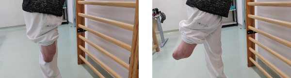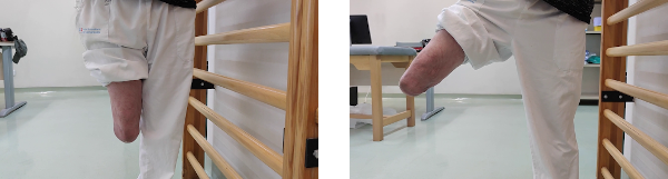 De pie frente a una superficie vertical donde podamos agarrarnos con facilidad, procedemos a realizar una extensión de cadera de la pierna amputada, sin mover el resto del cuerpo y sin flexionar el tronco. Mantenemos durante 5 segundos la cadera en máxima extensión y volvemos a la posición de partida para descansar otros 5 segundos.