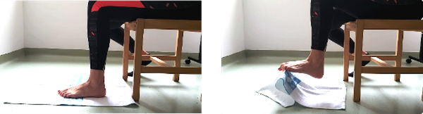 Sentado en una silla, con el pie apoyado sobre una toalla. Intentamos ir arrugando la toalla con los dedos del pie e incluso cogerla y levantarla del suelo.