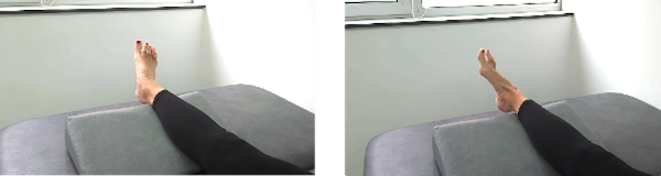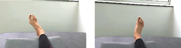 Sentado con las piernas estiradas. El pie puede estar sobre una cuña o algo similar o bien directamente sobre la superficie. Desde la posición de reposo llevaremos el pie hacia afuera y hacia arriba. Al final del recorrido mantendremos la posición durante 5 segundos. Volvemos lentamente a la posición de partida y ahora llevamos el pie hacia dentro y hacia arriba manteniendo otros 5 segundos. Posteriormente descansaremos en la posición inicial antes de la siguiente repetición.