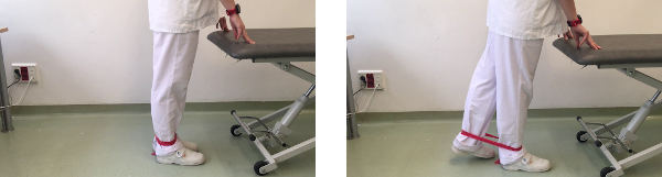 De pie, apoyados en una superficie con las manos. Una banda elástica rodea los dos tobillos, y echamos hacia atrás la pierna a movilizar con la rodilla completamente extendida. Mantenemos la posición 5 segundos y volvemos lentamente después hasta la posición de partida.