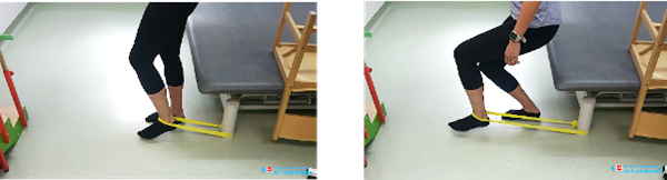 De pie, con una banda elástica atada desde el tobillo sano a la pata de una cama/mesa. Flexionamos el miembro inferior sano de tal manera que nos quedemos a la pata coja sobre el afecto. Bloqueando en esta posición la pierna sana, realizamos flexión y extensión del miembro inferior afecto. Si es necesario podemos buscar apoyo con una mano en la pared, mesa o similar. Intentaremos progresar en el ejercicio eliminando el apoyo de la mano.