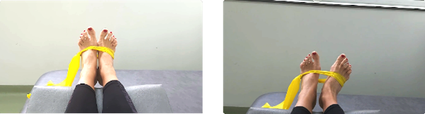 Sentado o tumbado semi-incorporado, con las rodillas estiradas y una banda elástica atada alrededor de los pies. Los pies sobre una cuña, cojín, almohada o toalla doblada. El pie izquierdo no se mueve. El pie derecho realiza un movimiento hacia arriba y hacia afuera. Volvemos a la posición de partida. El movimiento tanto de ida como de vuelta ha de realizarse de forma controlada y lenta.