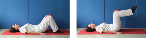 Tumbados boca arriba, con las piernas flexionadas y los pies alineados con las caderas. Colocamos un balón entre las rodillas y lo sujetamos con ellas. Contraemos abdominales llevando el ombligo hacia el suelo. Manteniendo la contracción abdominal elevamos las piernas manteniendo el balón entre las rodillas hasta la horizontal. Aguantamos esta posición durante 3 segundos y volvemos a la posición de partida, sin relajar abdominales hasta que estemos totalmente apoyados en el suelo.