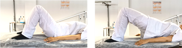 Tumbados boca arriba con las rodillas flexionadas y los pies apoyados. Despegamos los glúteos elevando las caderas intentando alinear los muslos con el tronco. Mantenemos durante 5 segundos y volvemos a la posición inicial.