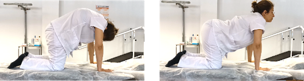 En posición de cuatro patas, con las manos debajo de los hombros y las rodillas alineadas con las caderas. Arqueamos la columna hacia arriba, llevando la cabeza hacia abajo. Mantenemos durante 5 segundos. Posteriormente haremos lo contrario, arquearemos la columna hacia abajo llevando la cabeza hacia arriba. Igualmente, mantendremos la posición durante 5 segundos.