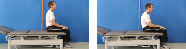 Sentados, con los pies bien apoyados en el suelo y la columna bien estirada. "Rodamos" sobre los glúteos hacia atrás, arqueando la zona lumbar. Posteriormente, volvemos a rodar sobre los glúteos, ahora hacia delante y estiramos progresivamente la espalda desde la zona lumbar hasta la cervical, exagerando el arco a nivel lumbar.