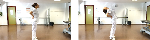 De pie, con los pies ligeramente separados y alineados con las caderas. Las manos situadas sobre la zona lumbar. Llevamos la cabeza hacia atrás arqueando la zona lumbar lo máximo posible. Mantenemos la posición durante 5 segundos y volvemos al punto inicial.