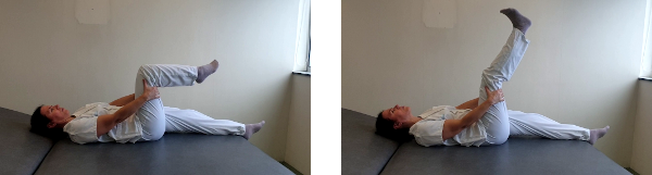 Tumbados boca arriba, flexionamos la cadera del lado afectado y sujetamos por el muslo con ambas manos. Estiramos la rodilla, llevando la punta del pie hacia nosotros y estiramos ligeramente el cuello; mantenemos esta posición durante 5 segundos. Desde ahí doblamos la rodilla hacia la posición de partida a la vez que flexionamos el cuello, bajando el mentón hacia el pecho; mantenemos esta posición también durante 5 segundos. Repetimos 10 veces seguidas este ejercicio.